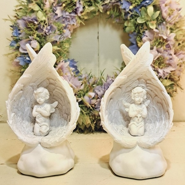 Keuze uit 2 varianten: een engeltje met de handjes over de borst gevouwen en een biddend engeltje met een kruisje in de handen.