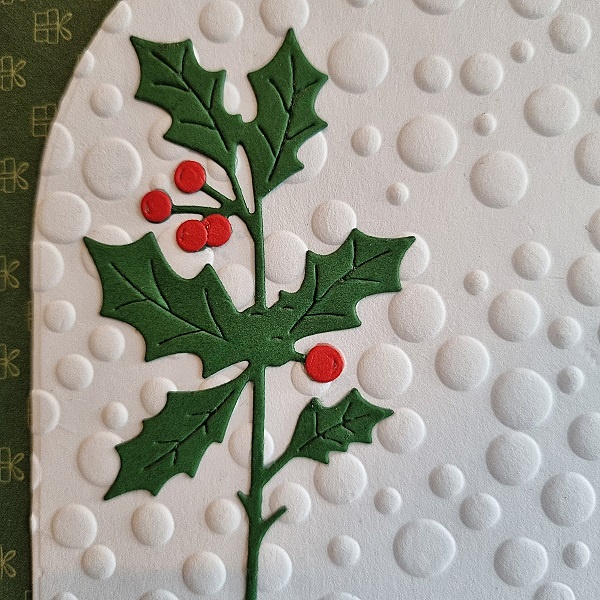Het groen van het hulstblad komt mooi terug in de groene achtergrond.