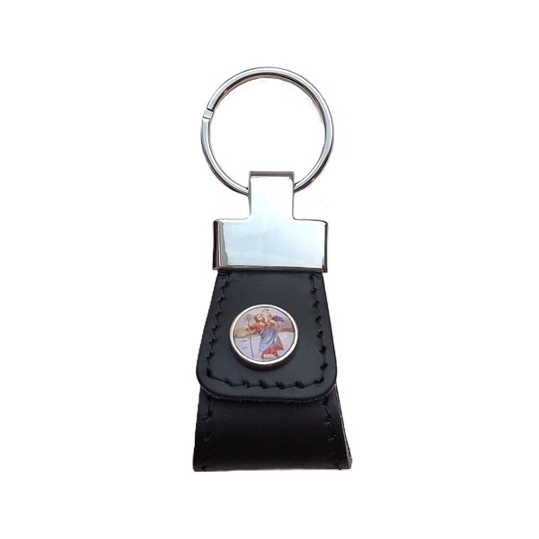 Een grote sleutelhanger gemaakt van leer en metaal met een full-color afbeelding van de Heilige Christoffel.