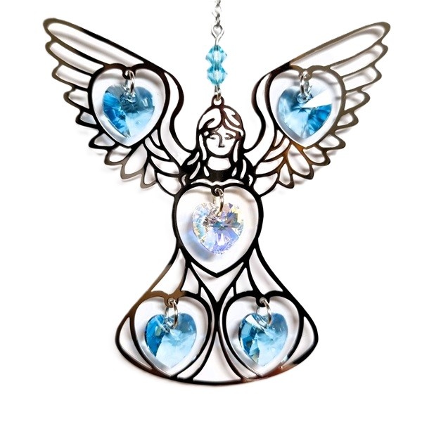 Een werkelijk prachtige grote engel suncatcher met kristal hartjes.De engel is van metaal waardoor het mooi het zonlicht weerkaatst.