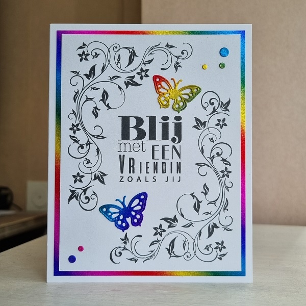 Deze vrolijke en kleurrijke kaart zegt eigenlijk al genoeg: Blij met een vriendin zoals jij! En dat mag je haar natuurlijk best laten weten!