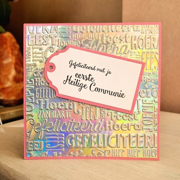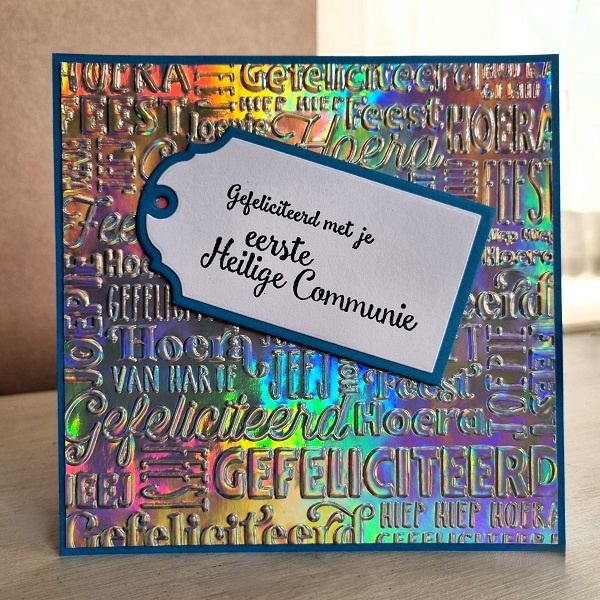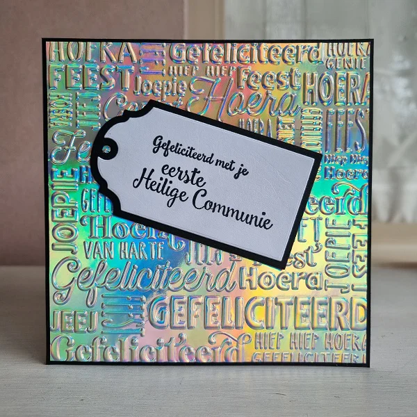 Een schitterende communiekaart die geschikt is voor zowel meisjes als jongetjes. De holografische achtergrond zorgt voor een extra feestelijk effect! De teksten zijn in relief in de kaart aangebracht.
