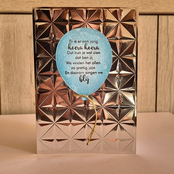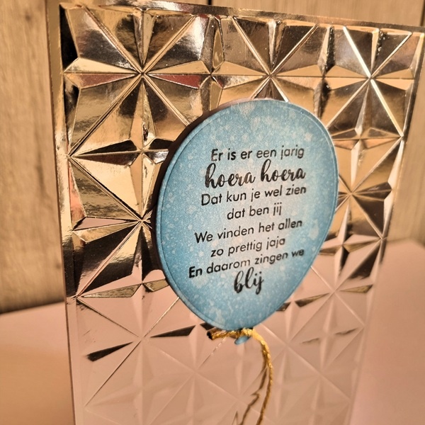 Dit leuke verjaardagsliedje staat op een mooie blauwe ballon op een bijzondere relief achtergrond. Het zilveren motief lijkt op allemaal schitterende diamantjes als hij in het licht beweegt. De ballon is iets verhoogd van de kaart aangebracht, waardoor het lijkt alsof hij aan het touwtje zweeft.
