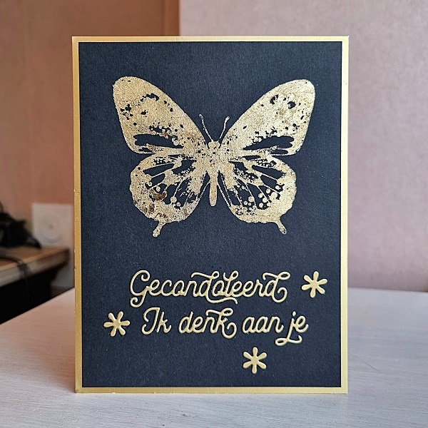 Een mooie condoleance kaart in zwart en goud tinten. Op de kaart staat een grote vlinder die is aangebracht d.m.v gilding flakes.