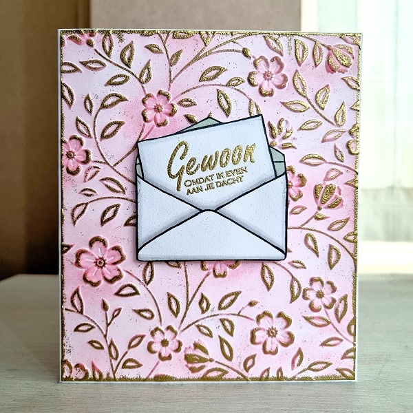 De tekst op het envelopje is ook d.m.w. heat embossing in goud aangebracht.