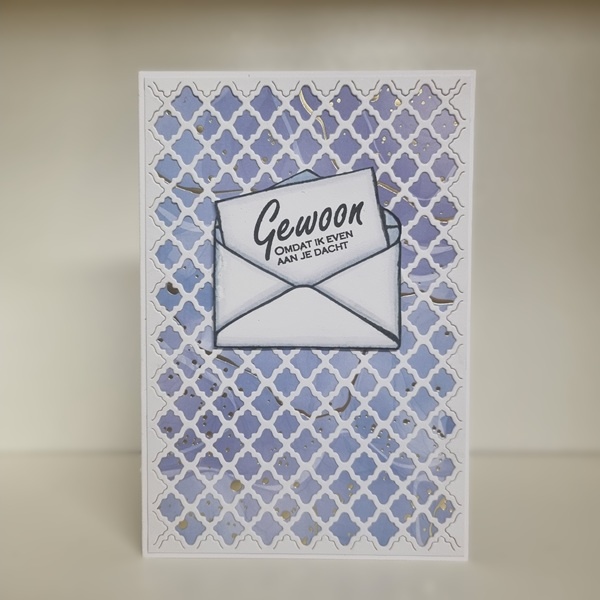 Een super lieve kaart met mooie achtergrond en een afbeelding van een enveloppe met daarin een briefje met de tekst: Gewoon, omdat ik even aan je dacht.