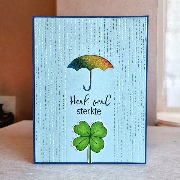 Een mooie symbolische kaart voor iemand die het even moeilijk heeft. De kleurrijke paraplu als schuilplekje tegen 'zwaar weer' waar iemand in zit. En het klavertje vier voor een beetje extra geluk...