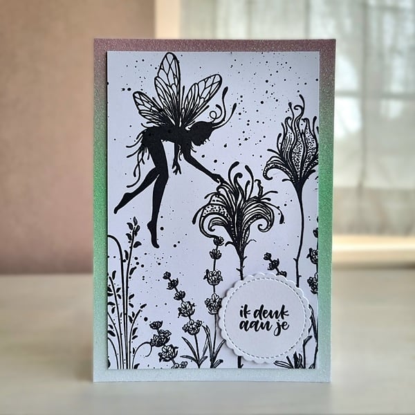 De hele kaart is in zwart wit en steekt daardoor mooi af tegen de ombre-achtergrond met glittereffect. De kleuren lopen over van roze naar groen naar wit en schitteren mooi in het licht, wat bijdraagt aan het fantasiegevoel van deze kaart.