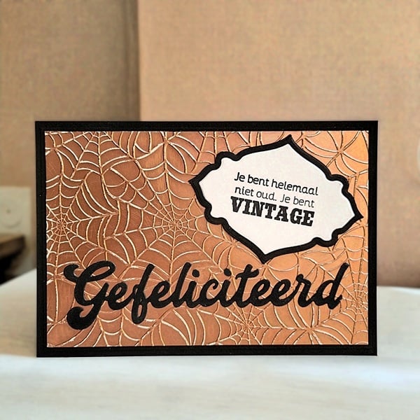 De achtergrond van de kaart heeft een relief van spinnewebben om het thema 'oud/vintage' nog wat extra kracht bij te zetten. De spinnewebben zijn iets verhoogd van de kaart, en deze heb ik voorzichtig 'geschuurd' zodat het bovenste laagje verwijderd wordt en de witte kleur zichtbaar wordt. Dit alles zorgt voor een leuke 'veroudering', net als bij de ontvang(st)er van deze kaart ;-)