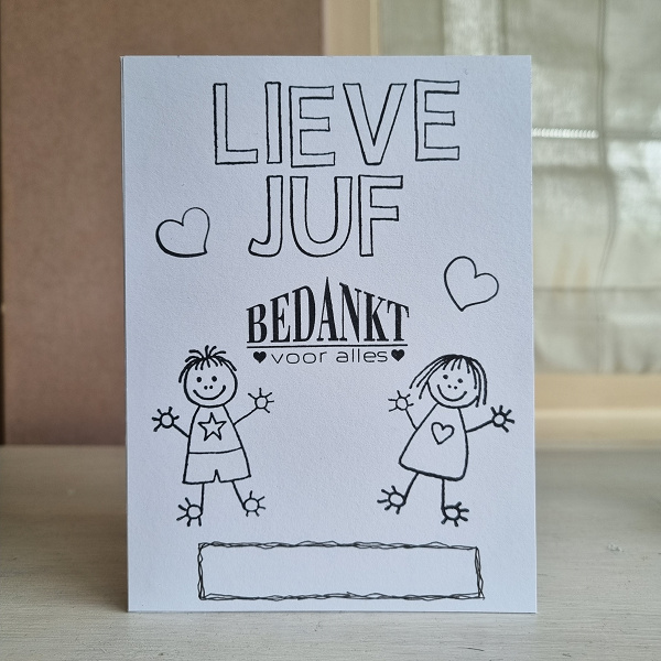 Een super leuke kaart om juf te bedanken, want deze kaart is een echte doe-het-zelf kaart! Je kunt hem namelijk zelf inkleuren, je kunt hem dus maken zoals jij hem mooi vindt.