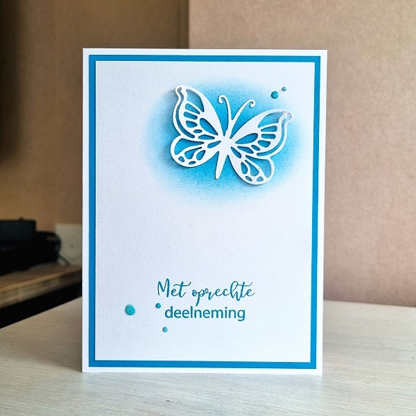 Een rustige, ingetogen condoleance kaart in wit en turqoise tinten en de tekst 'Met oprechte deelneming'.