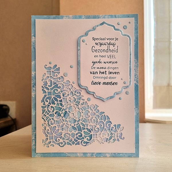 Op de kaart zijn mooie verfijne details aagebracht door middel van een zogenaamde 'aperture die' (snijmal met kleine openingen) Door de openingen is een achtergrond zichtbaar met allemaal verschilende tinten blauw. Die 'tekeningen' heb ik aangebracht met distress oxide inkt door middel van smooshing techniek. Hierbij breng je de distress inkt aan op een gladde ondergrond, deze verdun je met wat water en vervolgens dep je de inkt met behulp van een (zelfgemaakte) 'smoosher' aan op bijvoorbeeld karton. Hierdoor krijg je prachtige licht/donker effecten.