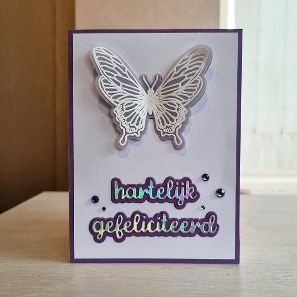 Op de kaart staat een mooie grote vlinder met pop-up vleugels. De tekst 'hartelijk gefeliciteerd' is gemaakt van holografisch karton zodat het mooie lichteffecten geeft als het in het licht gehouden wordt. De tekst is ook iets verhoogd van de kaart waardoor je een mooi schaduweffect krijgt.