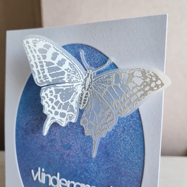 Een mooie wenskaart met een vlinder met opstaande vleugels en de tekst 'vlindergroet voor jou'.