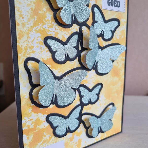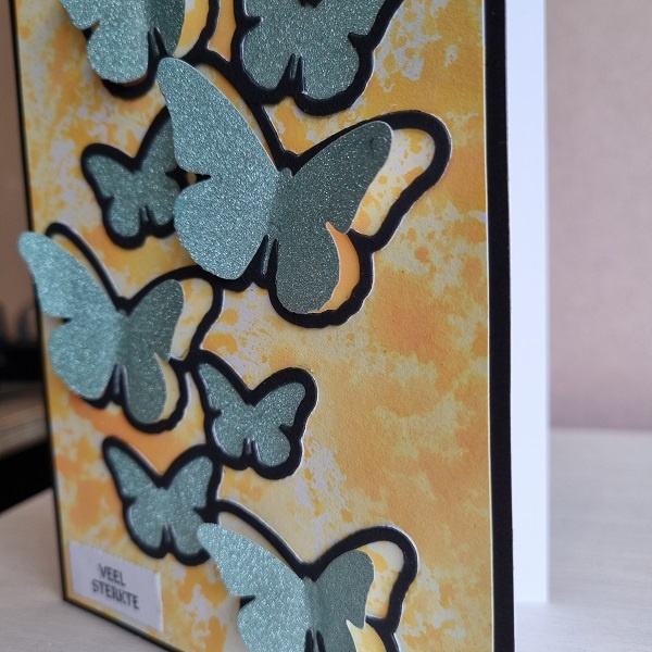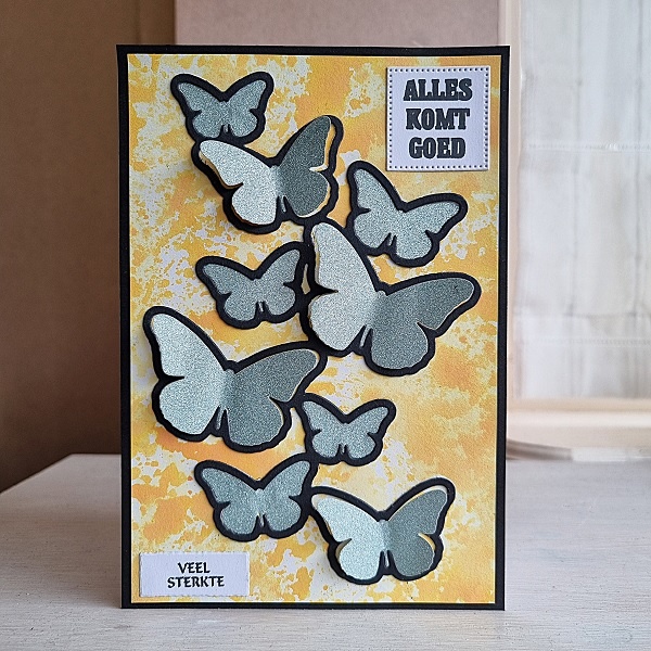 Een bijzondere wenskaart met heel veel vlinders waarvam sommige opstaande vleugels hebben. Hierdoor lijkt het alsof ze 'in vlucht' zijn. De zilverkleurige vlinders met glitter steken mooi af tegen de zachtgele gemarmerde achtergrond.