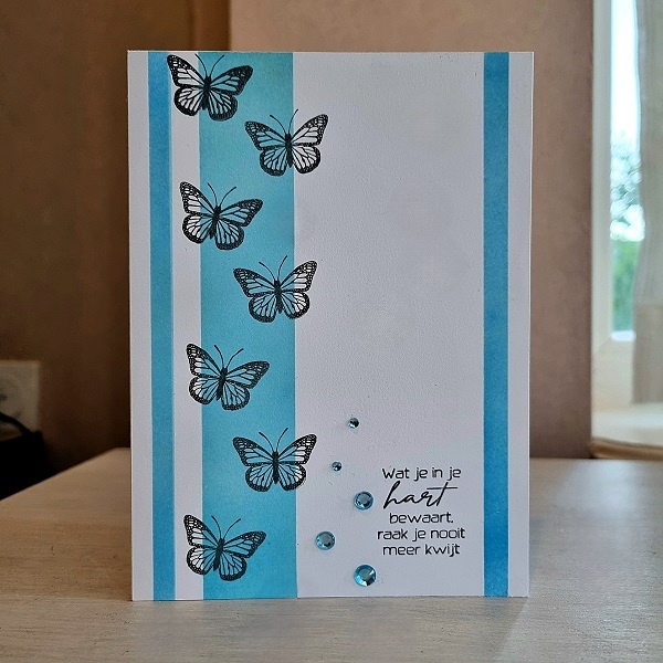 Een mooie wenskaart geheel in wit en lichtblauw met aan de linkerkant een rij mooie zwarte vlindertjes en de tekst: Wat je in je hart bewaart raak je nooit meer kwijt.